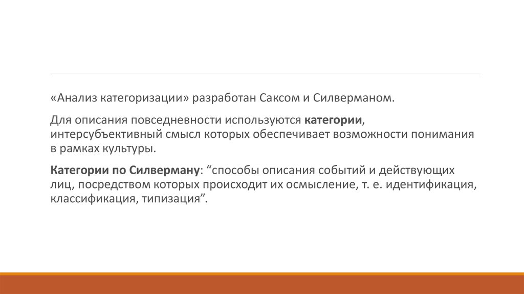 «Анализ категоризации» разработан Саксом и Силверманом.Для описания повседневности используются категории,