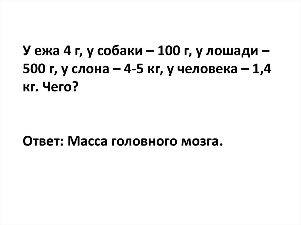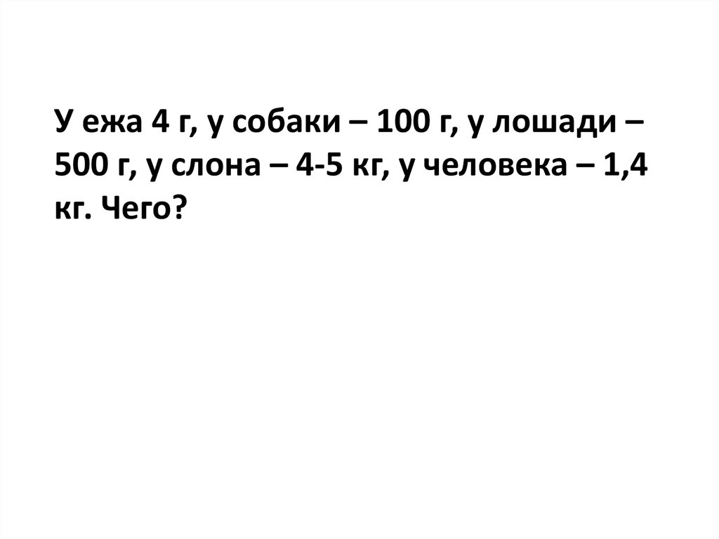 У ежа 4 г, у собаки – 100 г, у лошади –500 г, у слона – 4-5 кг, у человека – 1,4