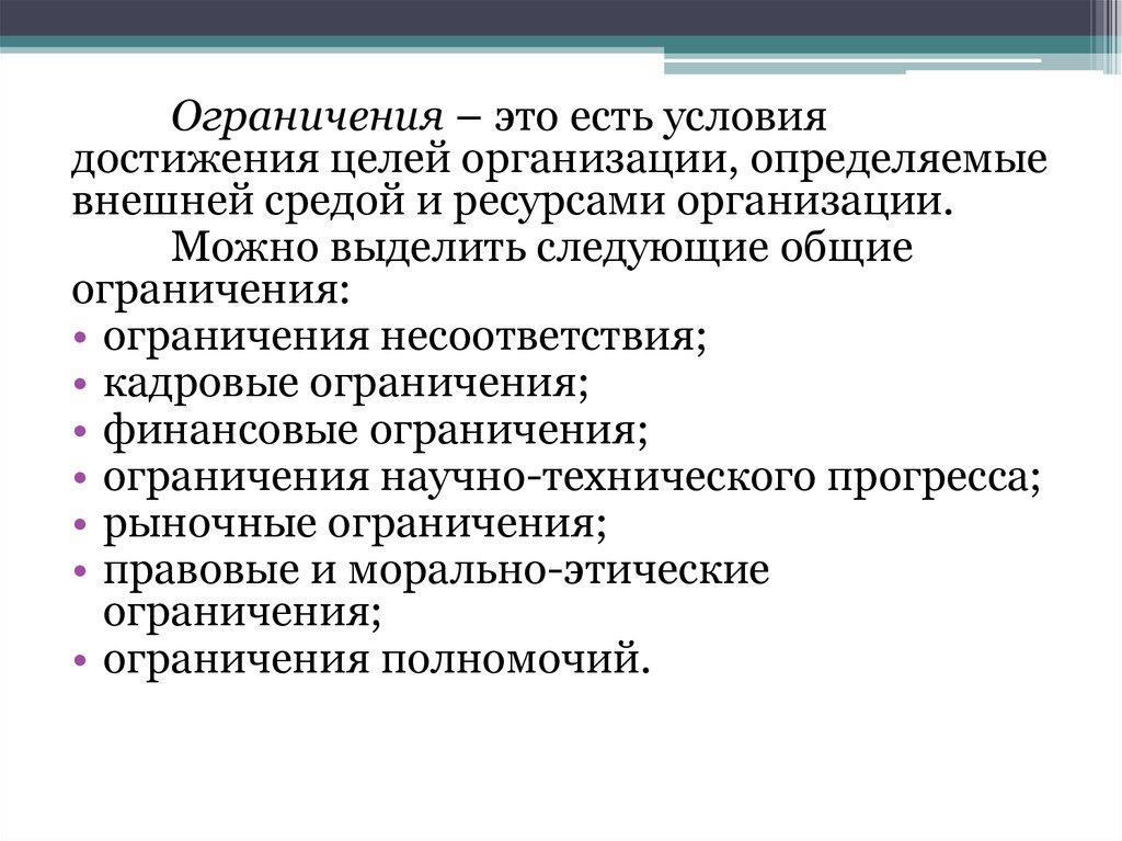 Ограничения – это есть условиядостижения целей организации, определяемые