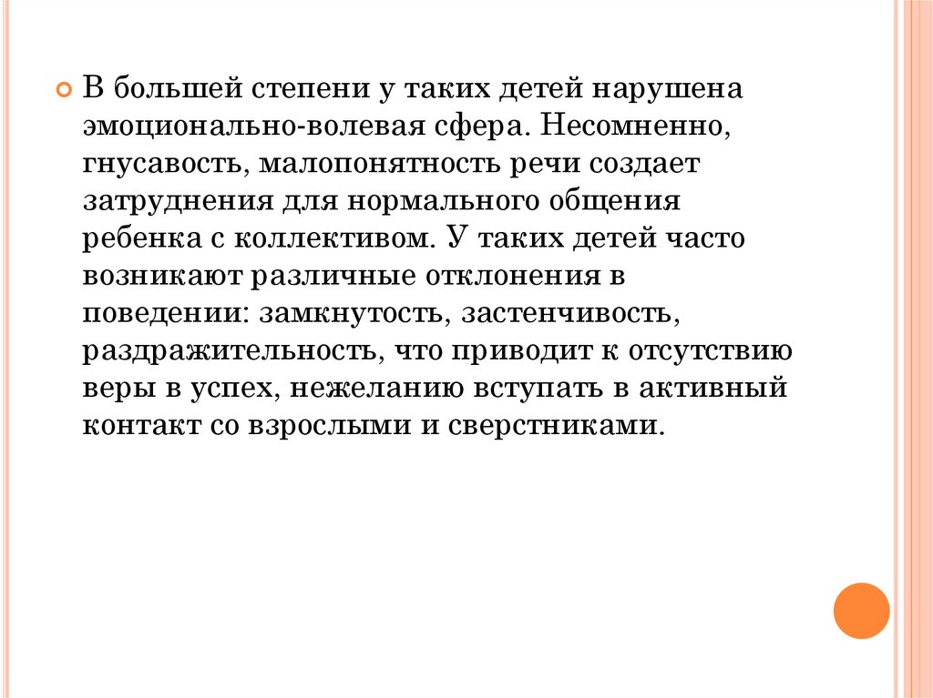 В большей степени у таких детей нарушенаэмоционально-волевая сфера. Несомненно,