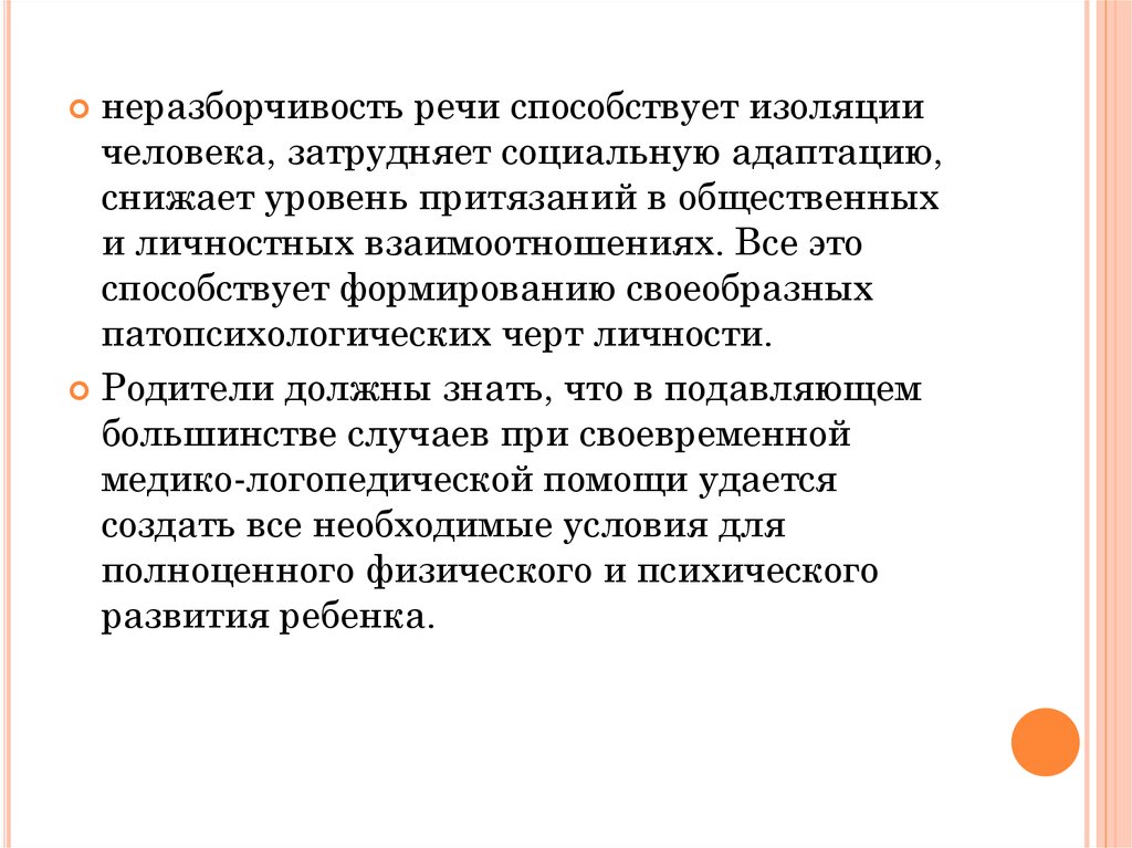 неразборчивость речи способствует изоляциичеловека, затрудняет социальную адаптацию,
