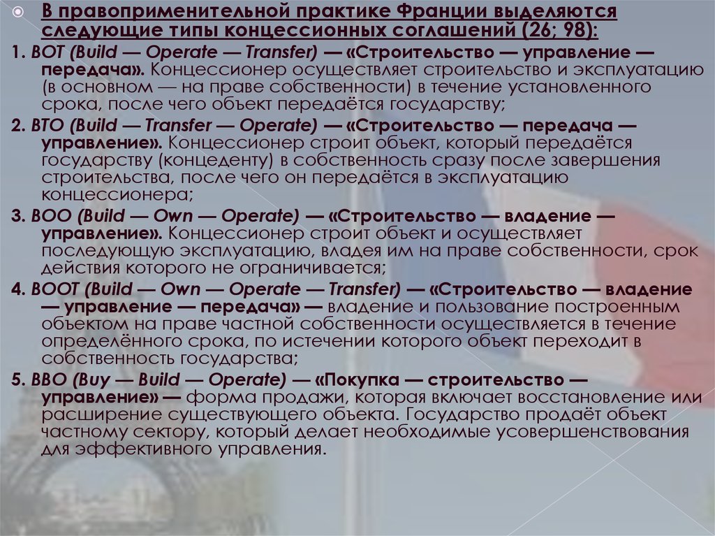 В правоприменительной практике Франции выделяютсяследующие типы концессионных соглашений (26; 98):