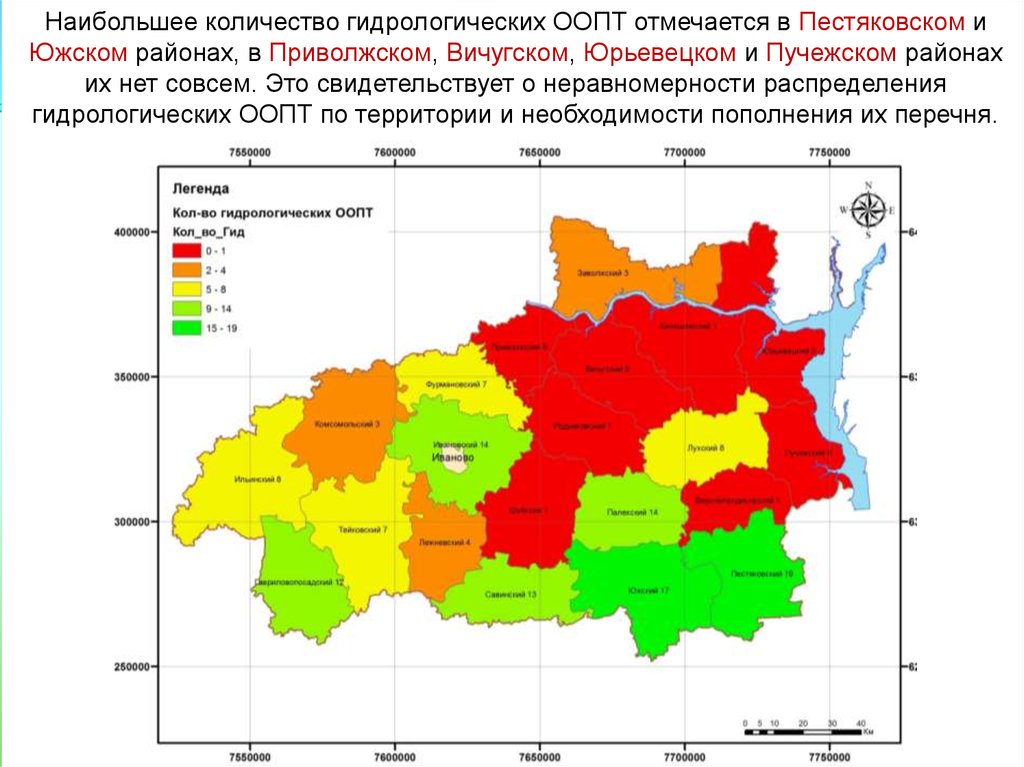 Наибольшее количество гидрологических ООПТ отмечается в Пестяковском иЮжском районах, в Приволжском, Вичугском, Юрьевецком и Пучежском районах