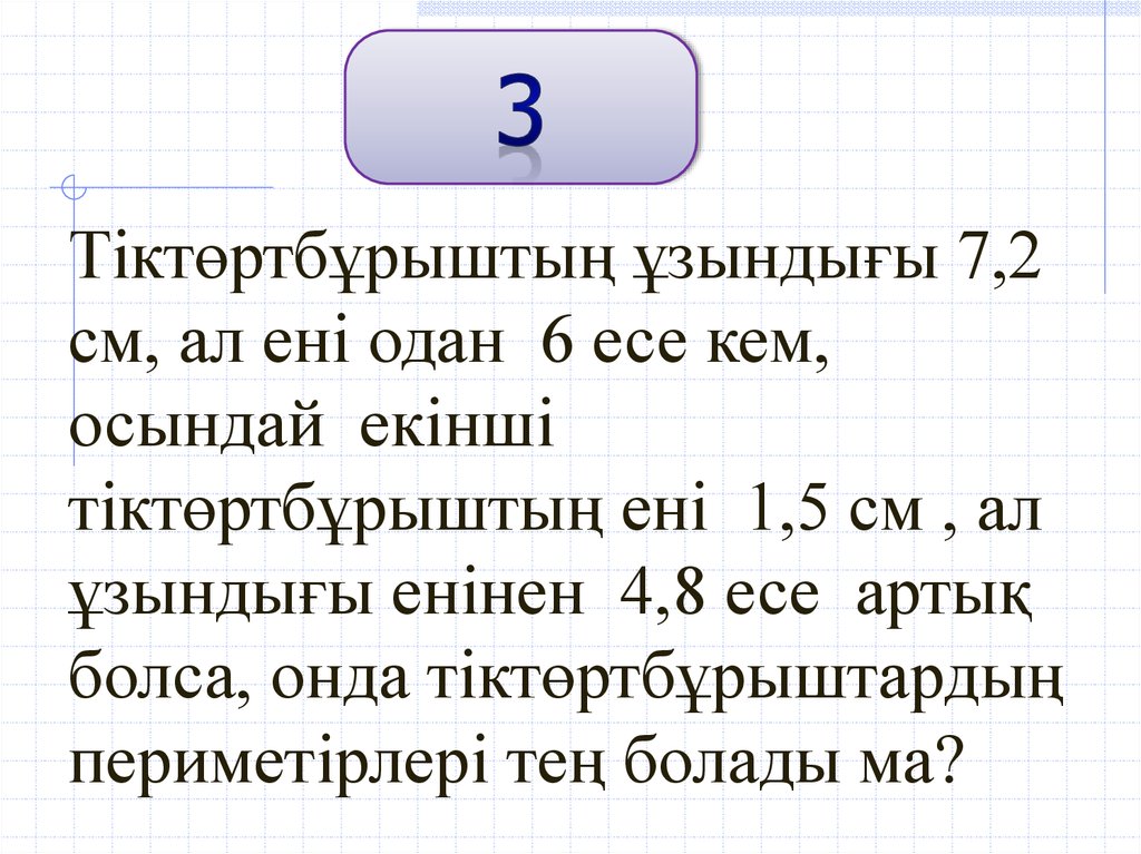 Тіктөртбұрыштың ұзындығы 7,2см, ал ені одан 6 есе кем,