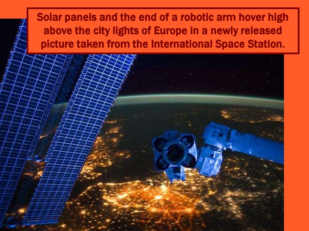 Solar panels and the end of a robotic arm hover highabove the city lights of Europe in a newly released