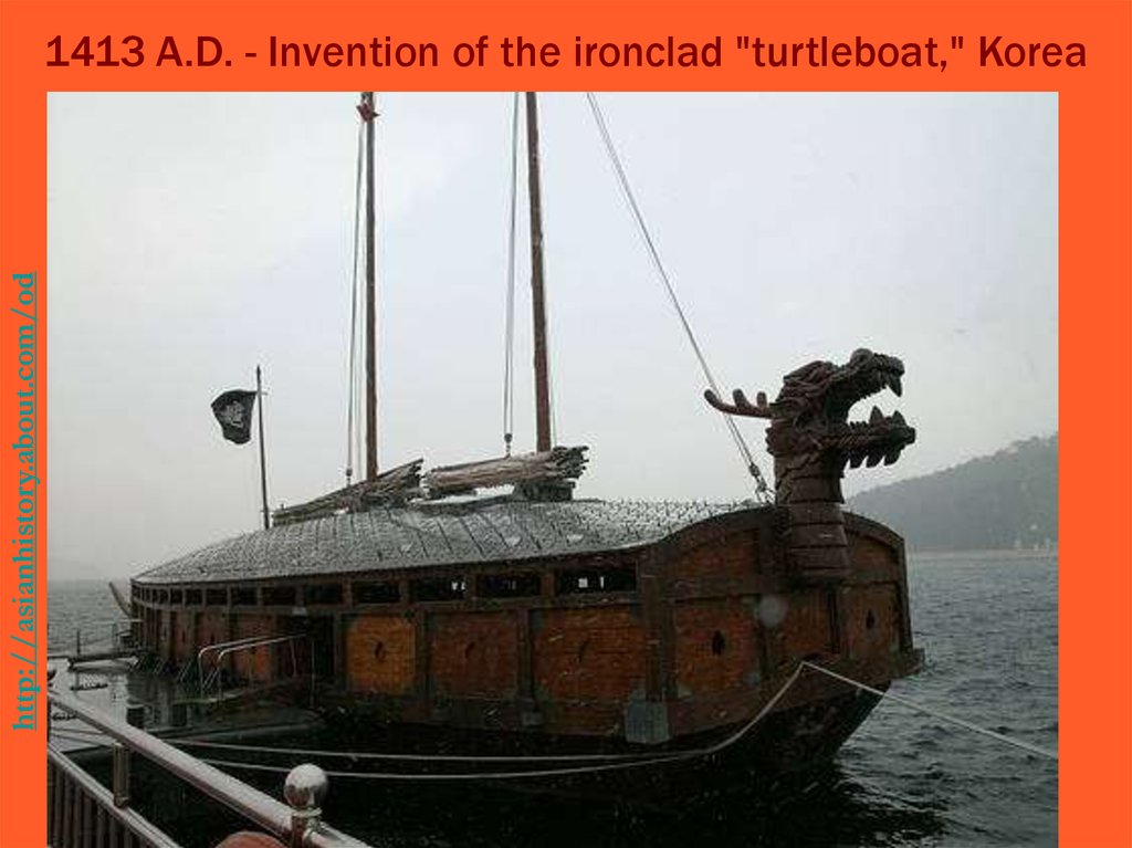 1413 A.D. - Invention of the ironclad "turtleboat," Korea