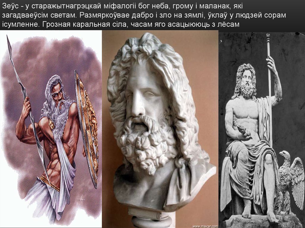 Зеўс - у старажытнагрэцкай міфалогіі бог неба, грому і маланак, якiзагадваеўсім светам. Размяркоўвае дабро і зло на зямлі, ўклаў у людзей сорам