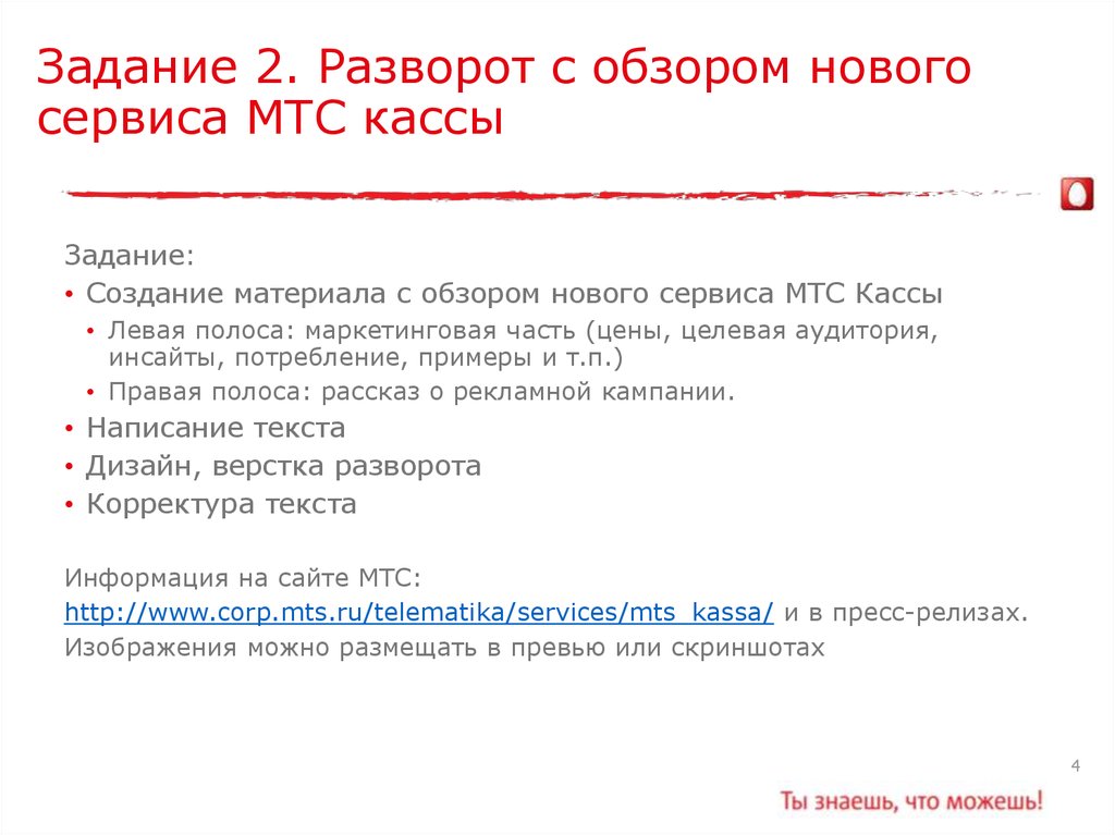 Задание 2. Разворот с обзором новогосервиса МТС кассы