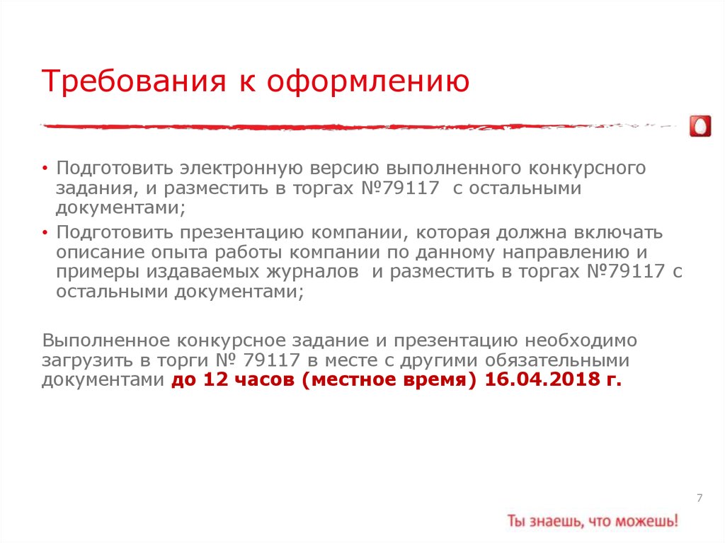 Требования к оформлению• Подготовить электронную версию выполненного конкурсного