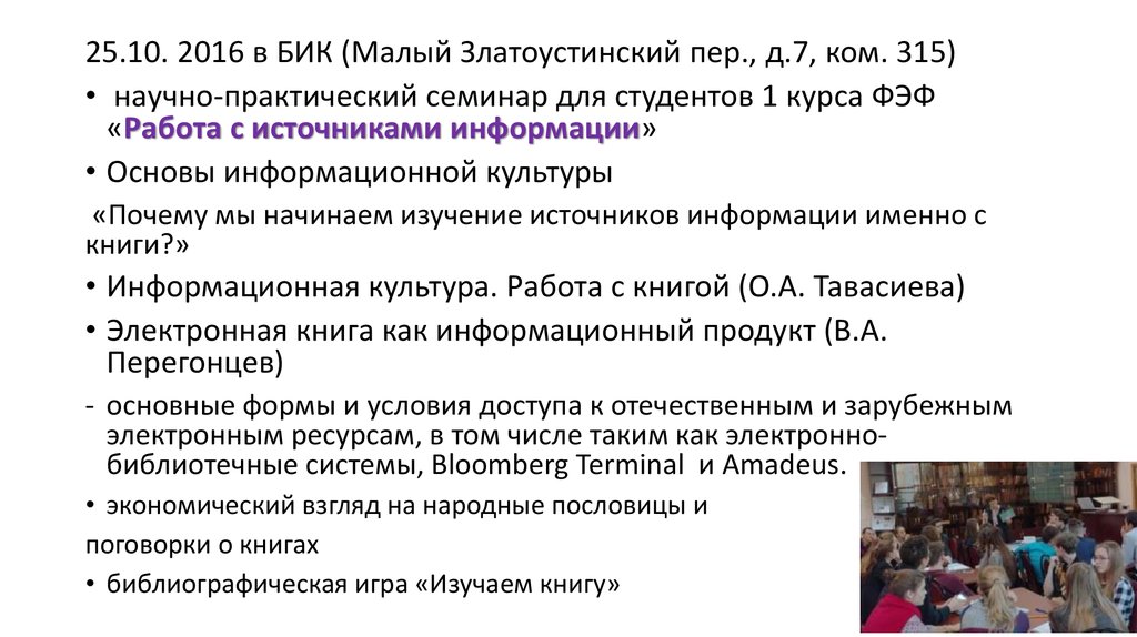 25.10. 2016 в БИК (Малый Златоустинский пер., д.7, ком. 315)• научно-практический семинар для студентов 1 курса ФЭФ