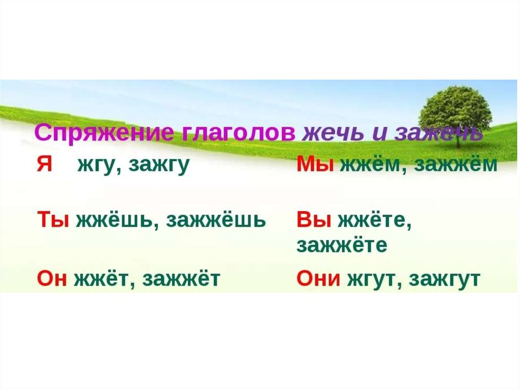 • Жгу – зажгу• Жжёт - жёг – буду жечь - зажгу