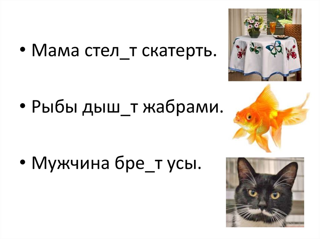 • Мама стел_т скатерть.• Рыбы дыш_т жабрами.