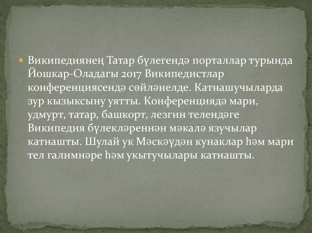 Википедиянең Татар бүлегендә порталлар турындаЙошкар-Оладагы 2017 Википедистлар