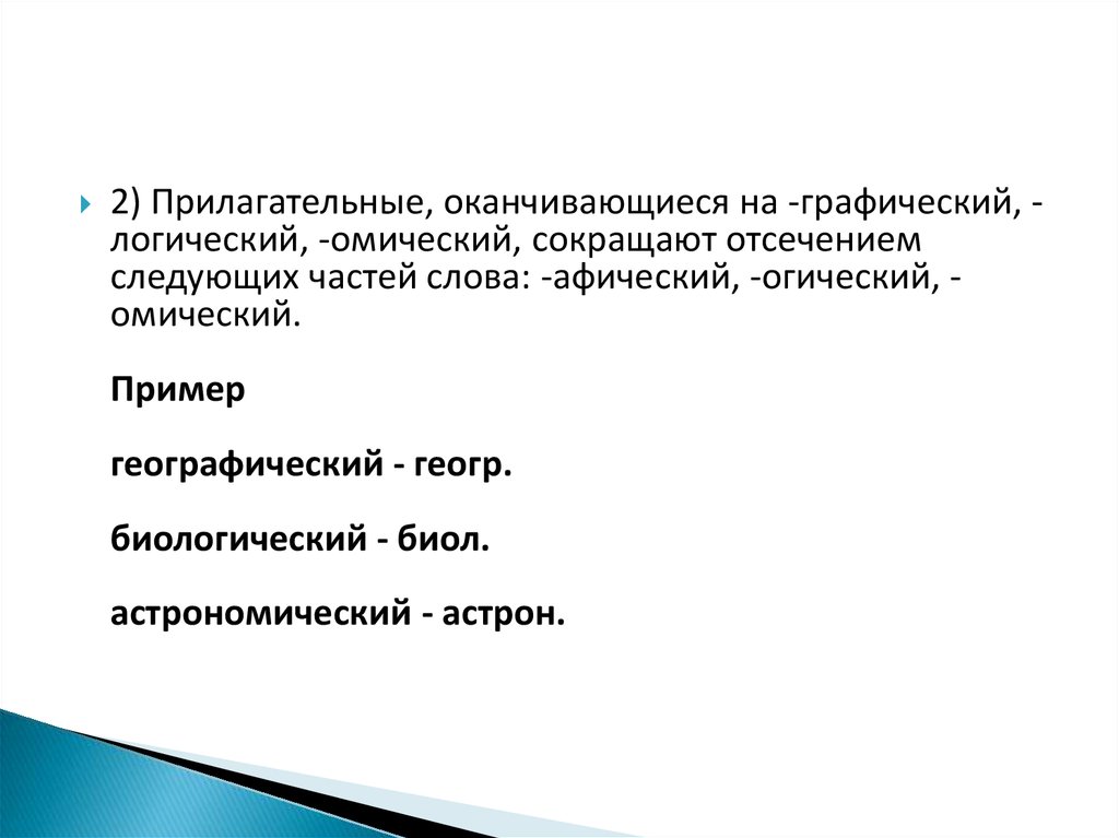 2) Прилагательные, оканчивающиеся на -графический, логический, -омический, сокращают отсечениемследующих частей слова: -афический, -огический, омический.