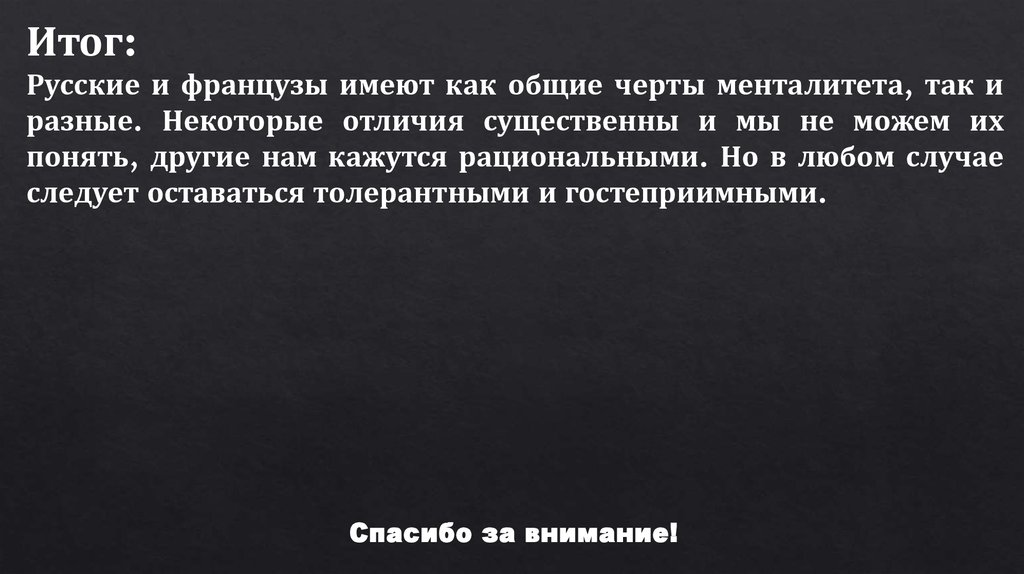 Итог:Русские и французы имеют как общие черты менталитета, так и