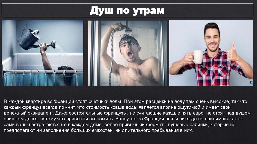 Душ по утрамВ каждой квартире во Франции стоят счётчики воды. При этом расценки на воду там очень высокие, так что