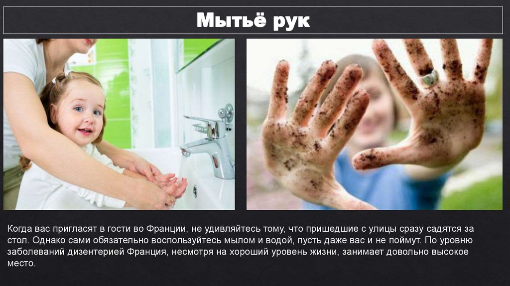 Мытьё рукКогда вас пригласят в гости во Франции, не удивляйтесь тому, что пришедшие с улицы сразу садятся за