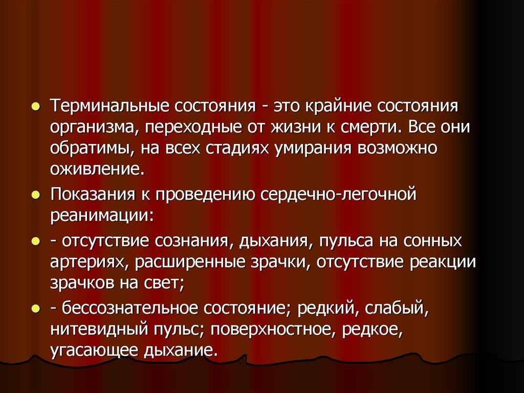 Терминальные состояния - это крайние состоянияорганизма, переходные от жизни к смерти. Все они