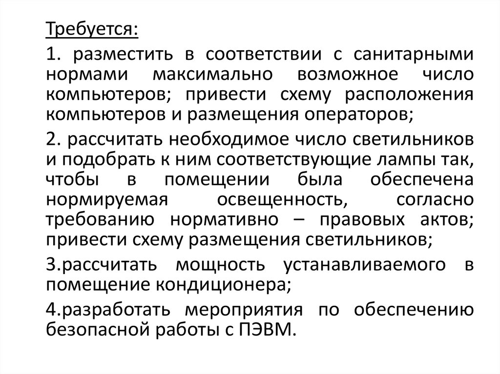 Размещение ПЭВМ в помещенииПлощадь на одно рабочее место пользователей ПЭВМ с видеодисплейные терминалы (ВДТ) на базе электронно-лучевой трубки (ЭЛТ)
