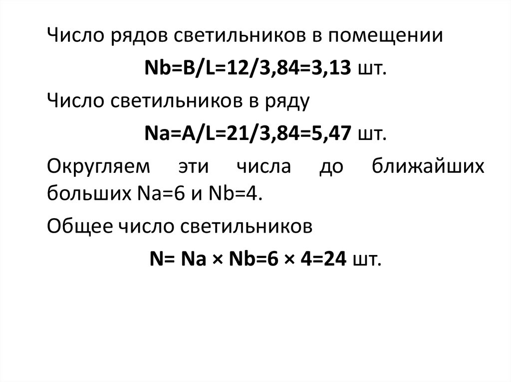 Число рядов светильников в помещенииNb=B/L=12/3,84=3,13 шт.