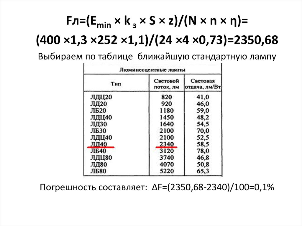 Fл=(Еmin × k з × S × z)/(N × n × η)=(400 ×1,3 ×252 ×1,1)/(24 ×4 ×0,73)=2350,68