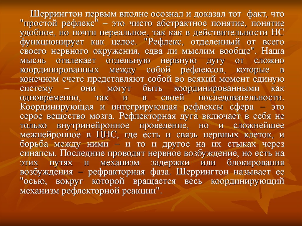 Шеррингтон первым вполне осознал и доказал тот факт, что"простой рефлекс" – это чисто абстрактное понятие, понятие