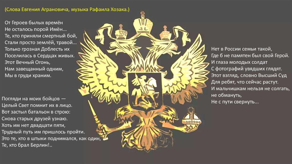 (Слова Евгения Аграновича, музыка Рафаила Хозака.)От Героев былых времён