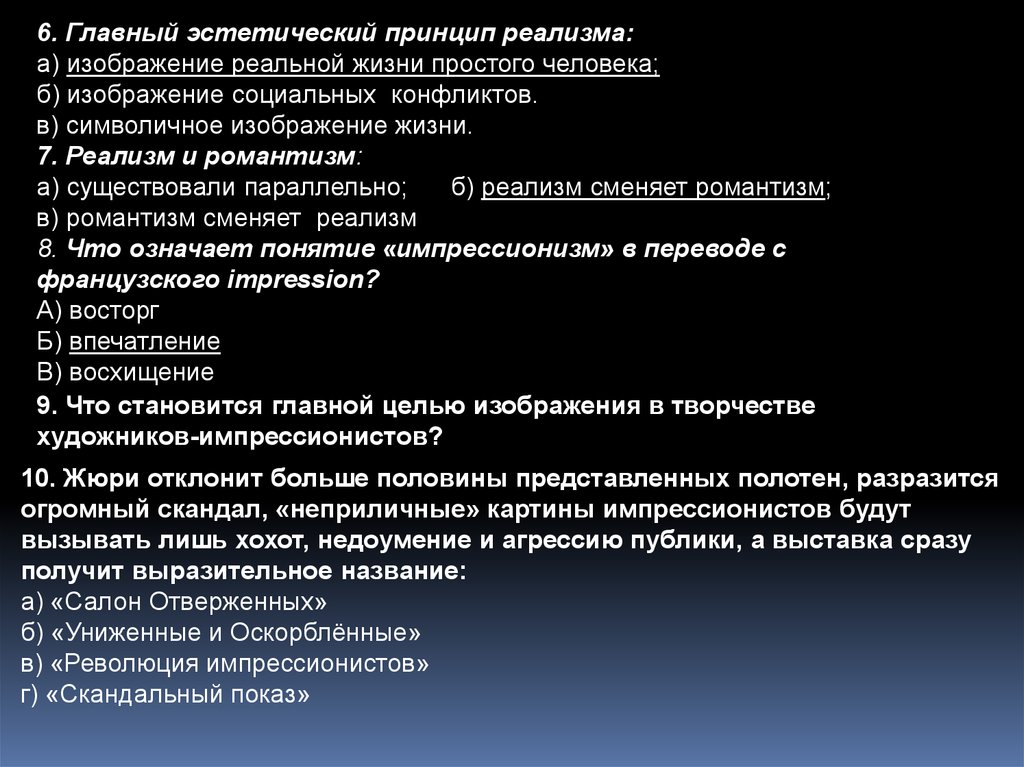 6. Главный эстетический принцип реализма:а) изображение реальной жизни простого человека;