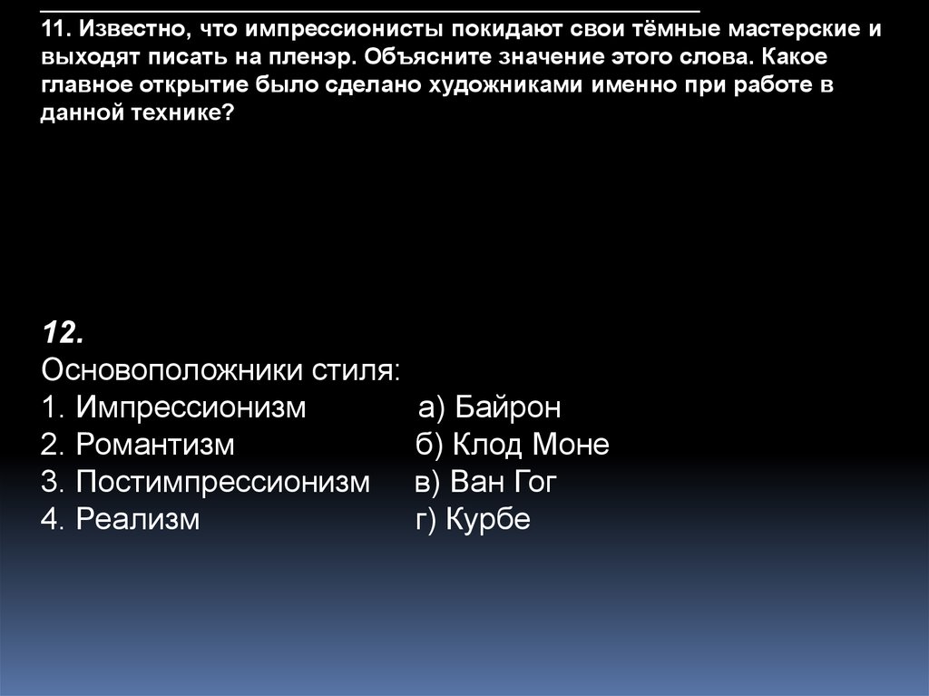 ___________________________________________________11. Известно, что импрессионисты покидают свои тёмные мастерские и