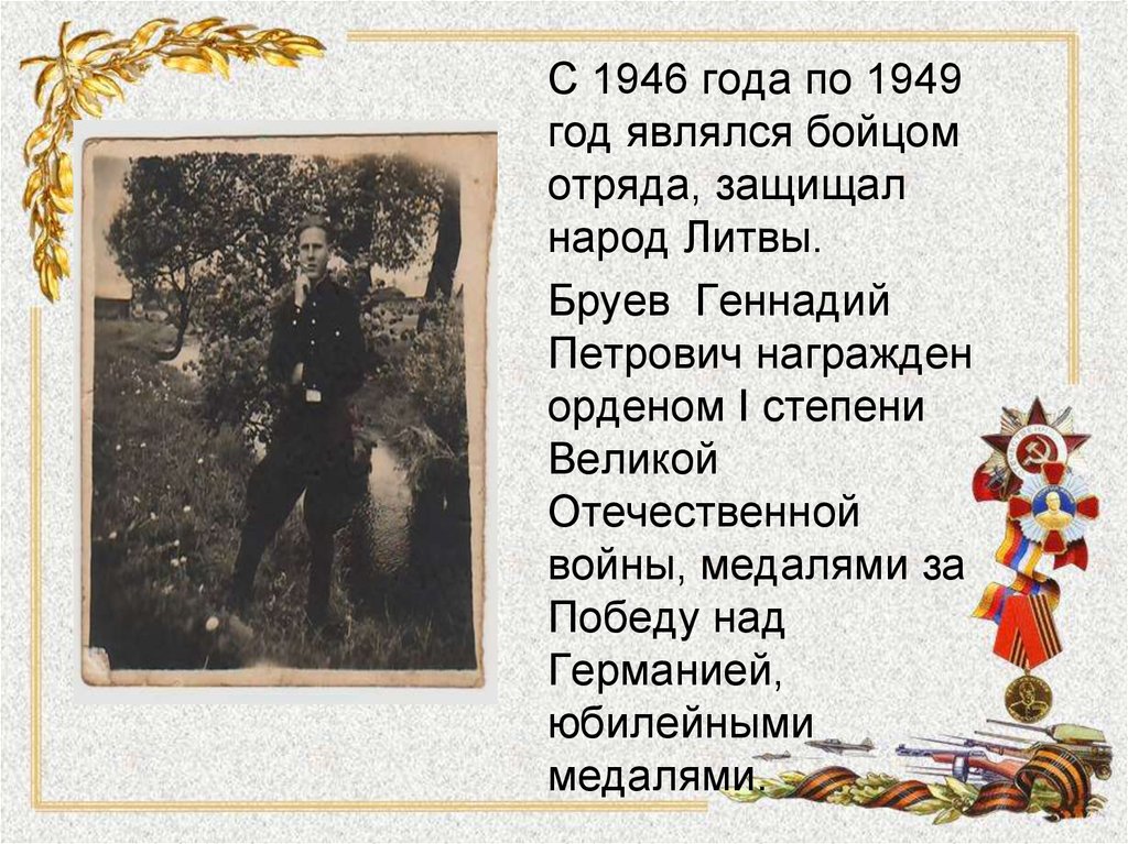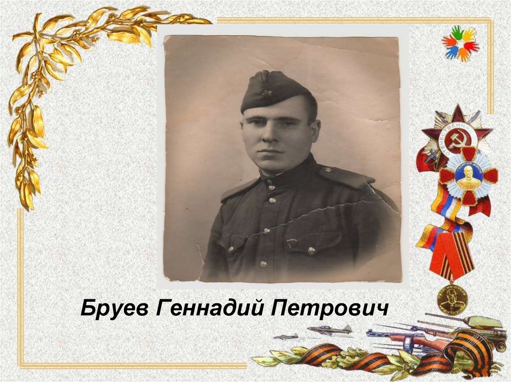 Бруев Геннадий Петрович2. Прадедушка, Бруев Геннадий Петрович, родился 10.11.1928 года в деревне Сумы Псковской области Новосокольнического района.
