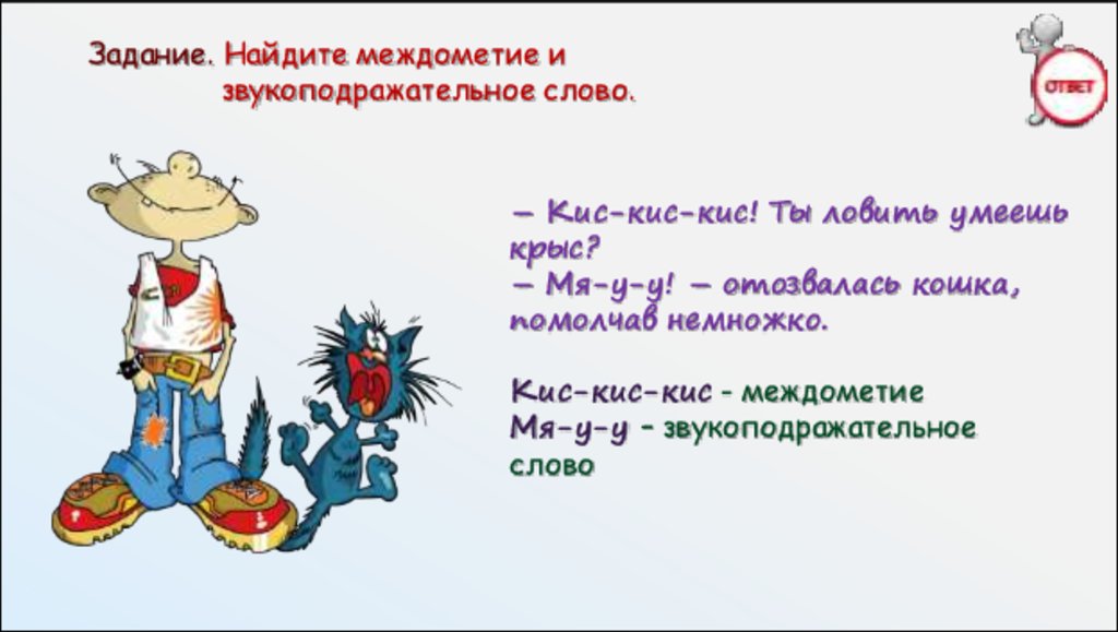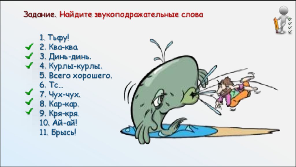 Задание. Найдите звукоподражательные слова1. Тьфу!