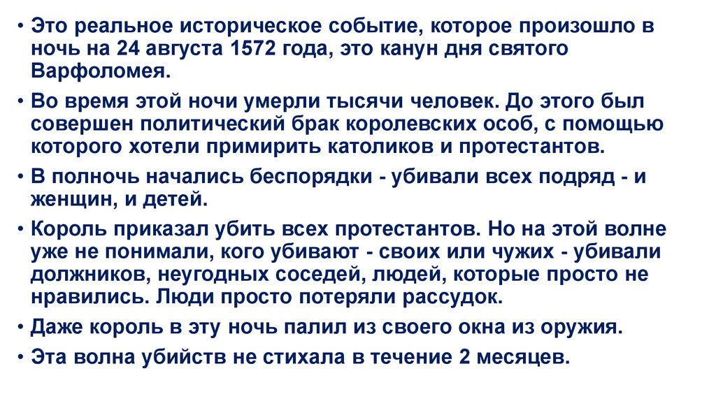 • Это реальное историческое событие, которое произошло вночь на 24 августа 1572 года, это канун дня святого