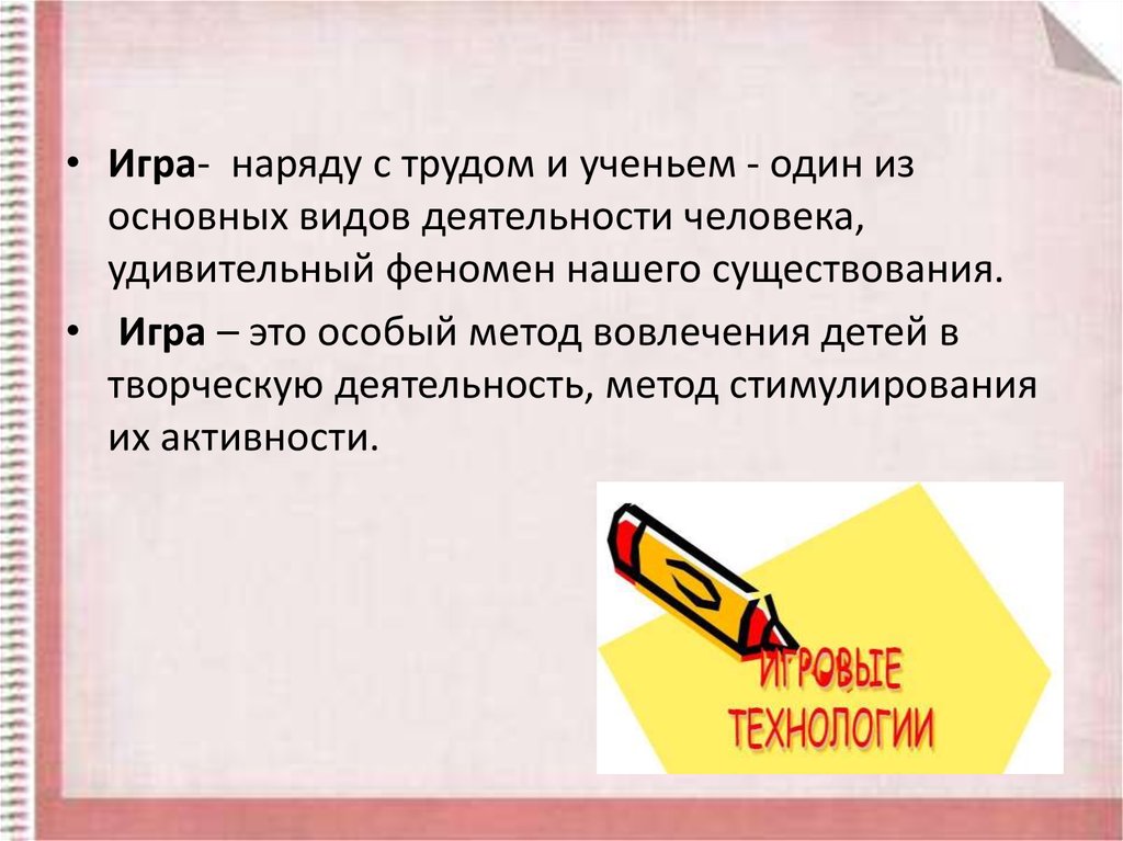 • Игра- наряду с трудом и ученьем - один изосновных видов деятельности человека,