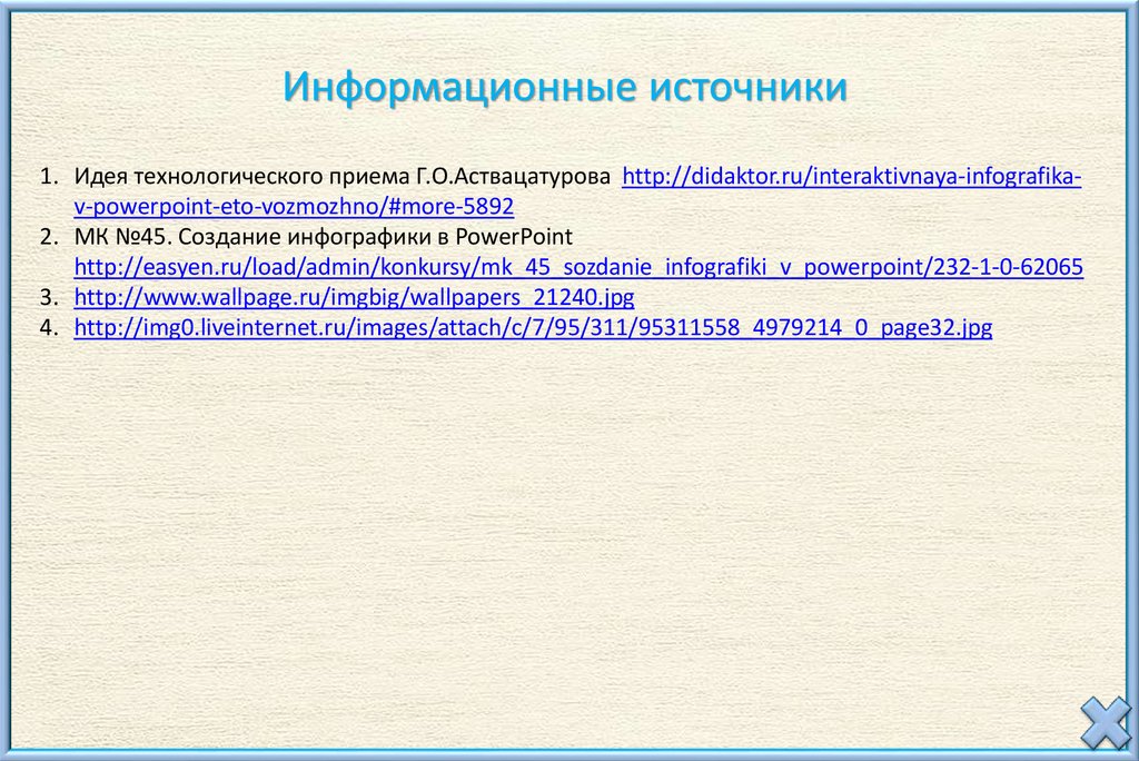 Информационные источники1. Идея технологического приема Г.О.Аствацатурова http://didaktor.ru/interaktivnaya-infografikav-powerpoint-eto-vozmozhno/#more-5892