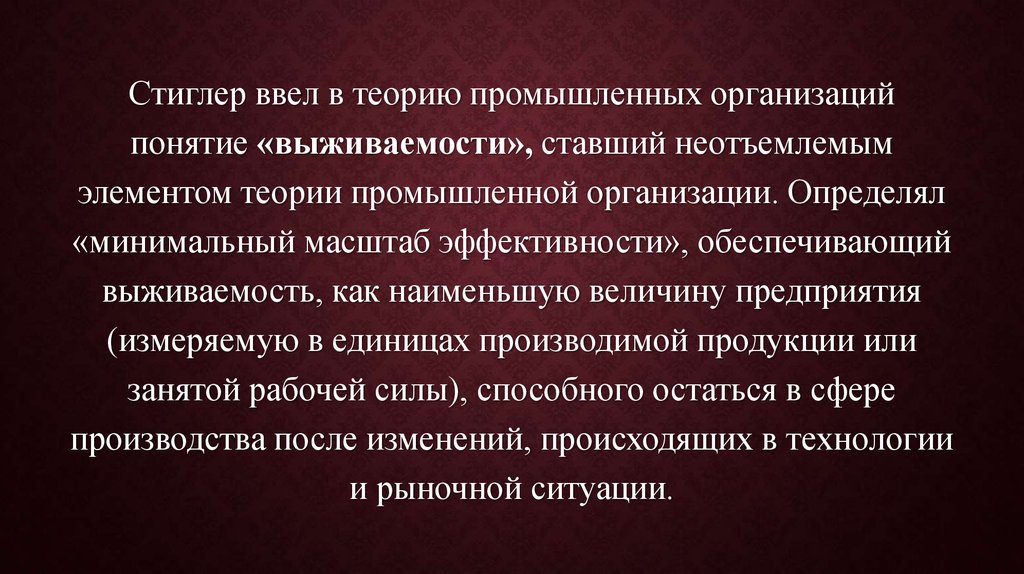Стиглер ввел в теорию промышленных организацийпонятие «выживаемости», ставший неотъемлемым