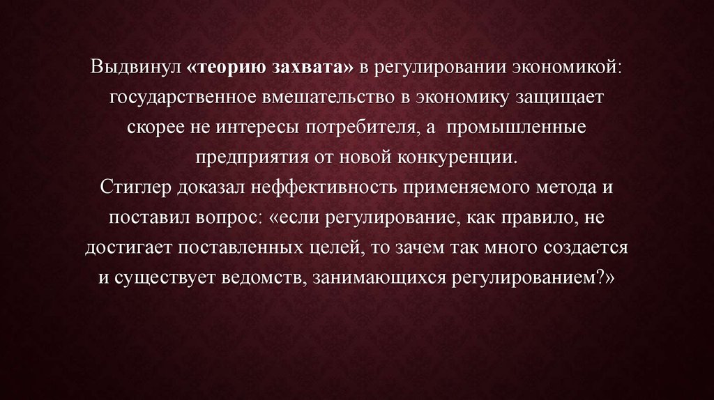 Выдвинул «теорию захвата» в регулировании экономикой:государственное вмешательство в экономику защищает