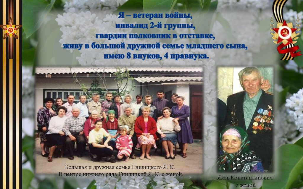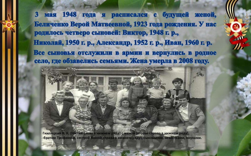 Гнилицкий Я. К. (третий слева в нижнем ряду) с женой (вторая справа в нижнем ряду),братом Трофимом, сестрой Анной(справа в нижнем ряду), сыновьями, невестками, внуками.