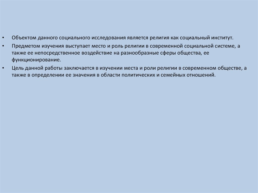 Предметом изучения выступает место и роль религии в современной социальной системе, а