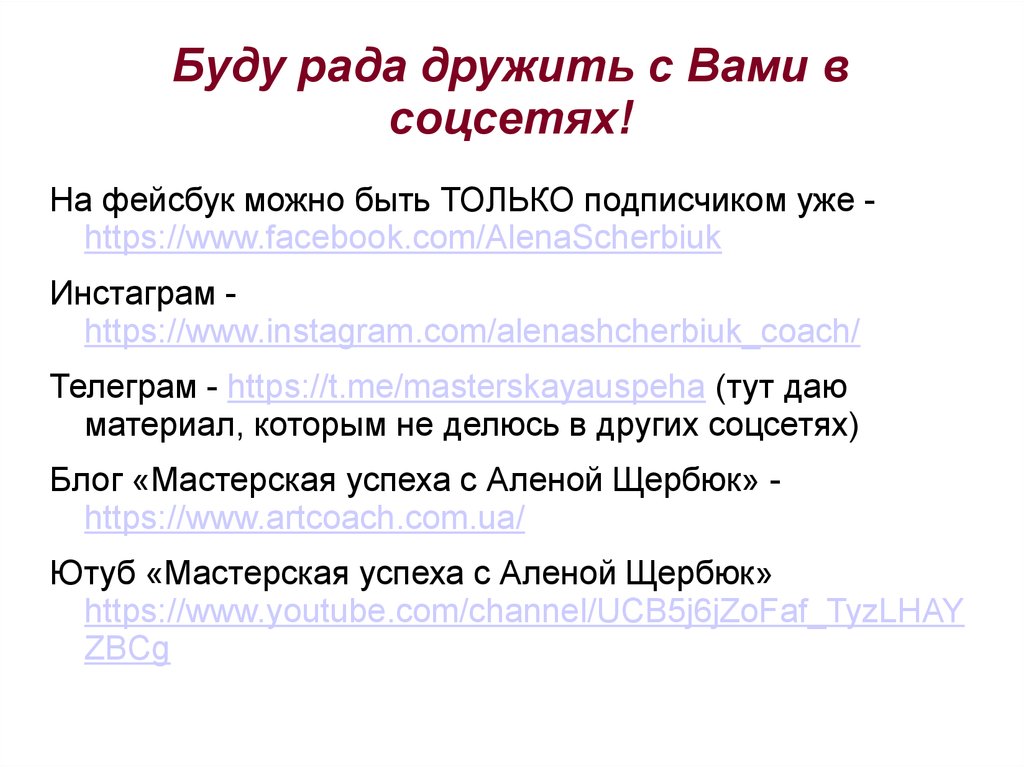 Инстаграм https://www.instagram.com/alenashcherbiuk_coach/