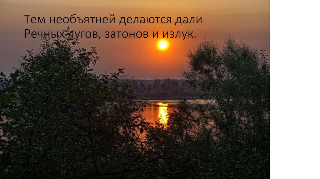 Тем необъятней делаются далиРечных лугов, затонов и излук.