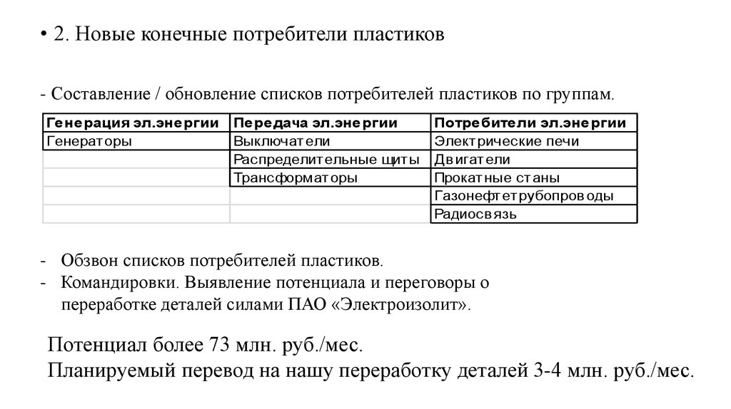 • 2. Новые конечные потребители пластиков- Составление / обновление списков потребителей пластиков по группам.