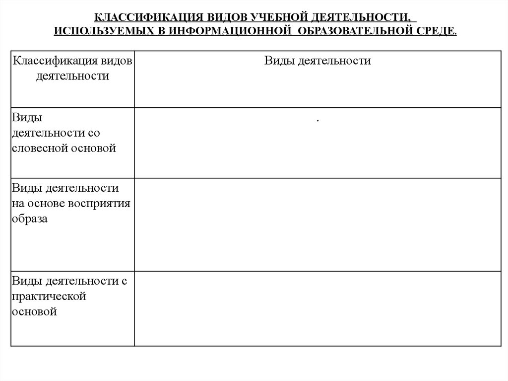 КЛАССИФИКАЦИЯ ВИДОВ УЧЕБНОЙ ДЕЯТЕЛЬНОСТИ,ИСПОЛЬЗУЕМЫХ В ИНФОРМАЦИОННОЙ ОБРАЗОВАТЕЛЬНОЙ СРЕДЕ.