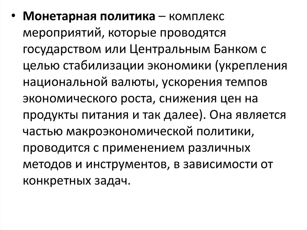 • Монетарная политика – комплексмероприятий, которые проводятся