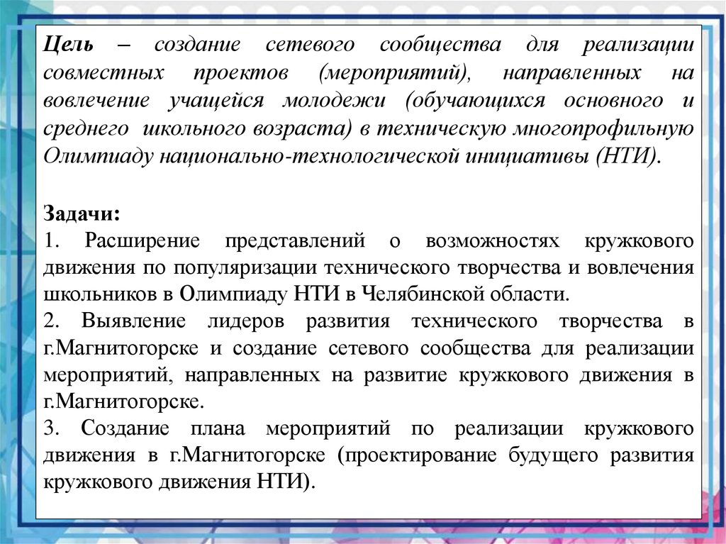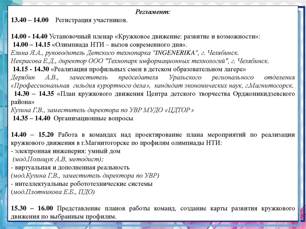 кружкового движения в г.Магнитогорске по профилям олимпиады НТИ: