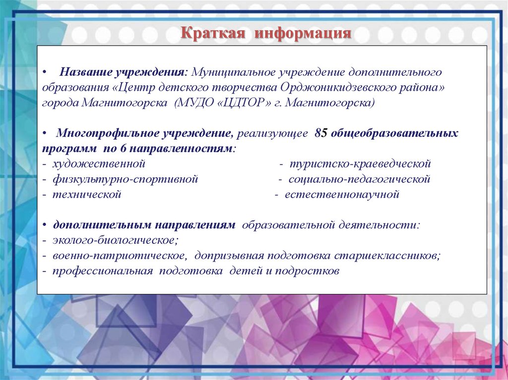 Краткая информация• Название учреждения: Муниципальное учреждение дополнительного