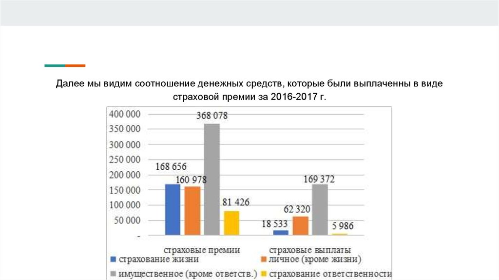 Далее мы видим соотношение денежных средств, которые были выплаченны в видестраховой премии за 2016-2017 г.