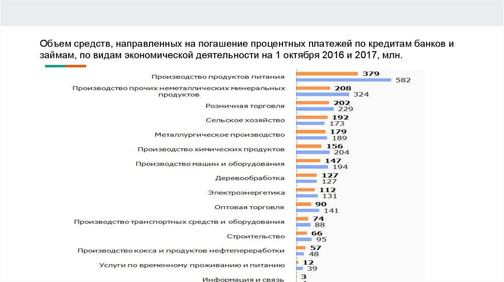 Объем средств, направленных на погашение процентных платежей по кредитам банков изаймам, по видам экономической деятельности на 1 октября 2016 и 2017, млн.