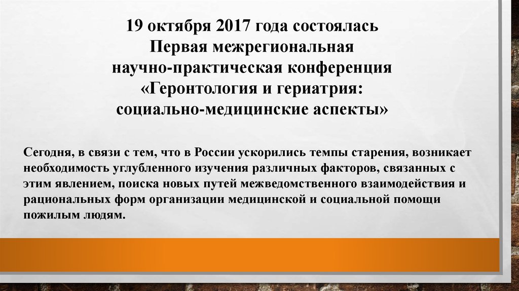 Первая межрегиональная научно-практическая конференция «Геронтология и гериатрия: социально-медицинские аспекты»