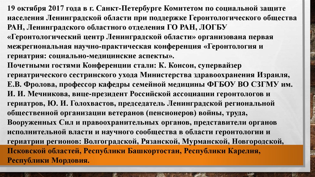 19 октября 2017 года в г. Санкт-Петербурге Комитетом по социальной защитенаселения Ленинградской области при поддержке Геронтологического общества