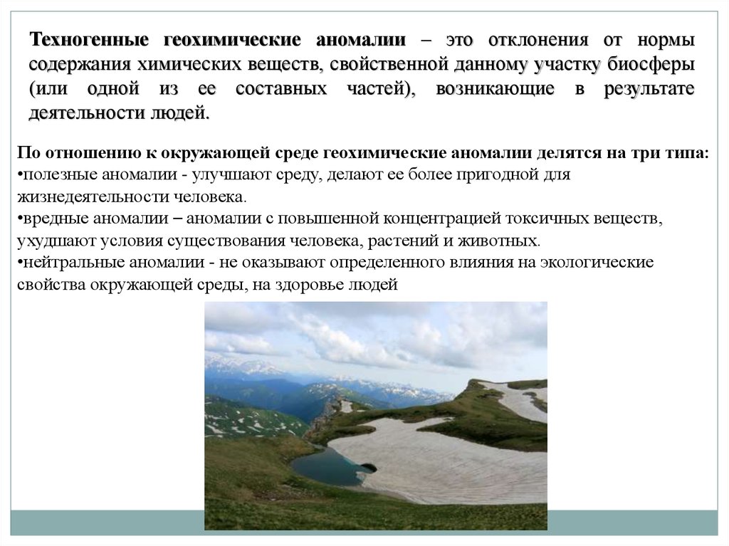 Техногенные геохимические аномалии – это отклонения от нормысодержания химических веществ, свойственной данному участку биосферы